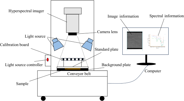 本研究中使用的高光谱成像系统是由江苏双利合谱科技有限公司设计和开发的GaiaSorter-Dual全波段高光谱成像系统,如图1所示。该成像系统采用推扫式(push-broom)成像方式,光谱范围为920.8–2528.6纳米,光谱分辨率为5.7纳米,有效狭缝长度为9.6毫米,狭缝宽度为30微米,包含256个光谱通道,像素尺寸为30×30微米。图像采集速度设置为3厘米/秒,曝光时间为6毫秒,帧率为70赫兹。