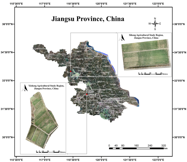 本研究于2019-2020年在江苏省仪征市和泗洪县进行。选取了8个试验地作为研究对象,其中6个地块存在不同程度的杂草侵扰,其余2个地块保持无杂草对照。