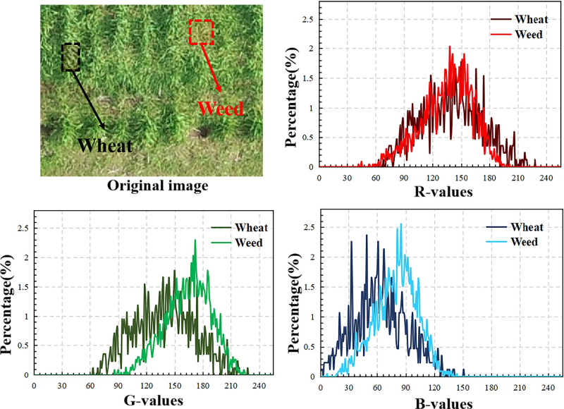 在 RGB 三通道及可见—近红外(400–1000 nm)范围内,杂草与小麦的光谱/颜色特征高度重叠:在 RGB 直方图上三通道分布非常相似,反射率曲线在多数波段亦存在大量重叠,仅在可见光的绿波段和红波段出现有限差异。这意味着单纯依赖颜色或单一植被指数(如 NDVI)在混合像元环境下难以实现可靠分辨,尤其在返青期或株型复杂的田块中误判与漏判风险显著增大。基于此,研究比较了五种主流语义分割模型用于田间杂草识别的效果,结果表明 DeepLabV3+ 综合性能最好:对耕地(land)识别普适性高,对小麦与杂草的区分能力强,边缘区域的识别效果尤为明显。模型在不同播种方式下的检测精度分别为散播田约 91.27%、条播田约 87.51%,MIoU、F1、Precision、Recall 等指标均保持在较高水平(均 >85%)。在实际部署角度看,DeepLabV3+ 的单张图像处理时间约 46.5 ms,具备近实时处理能力,但该模型本身只能判别“有/无”或像元类别,不能直接量化杂草密度或推断个体数量,这是其在工程化应用中的一项重要局限。