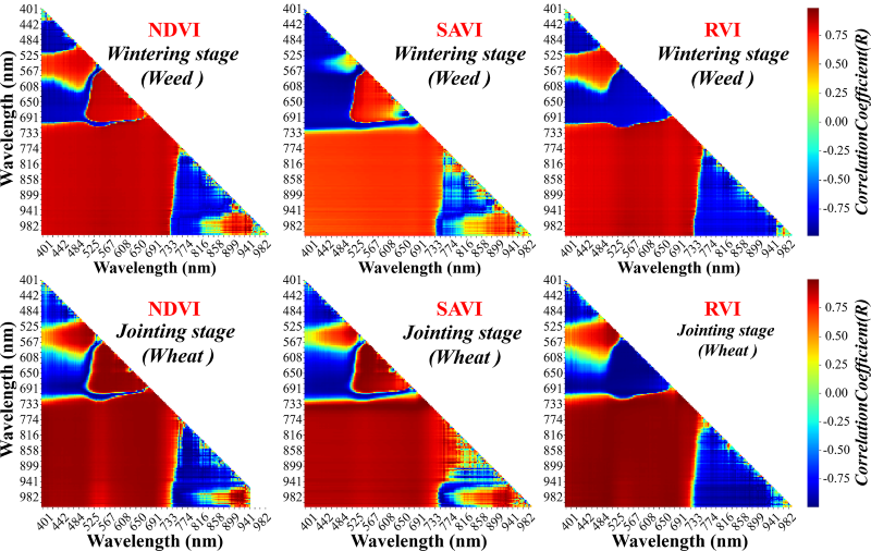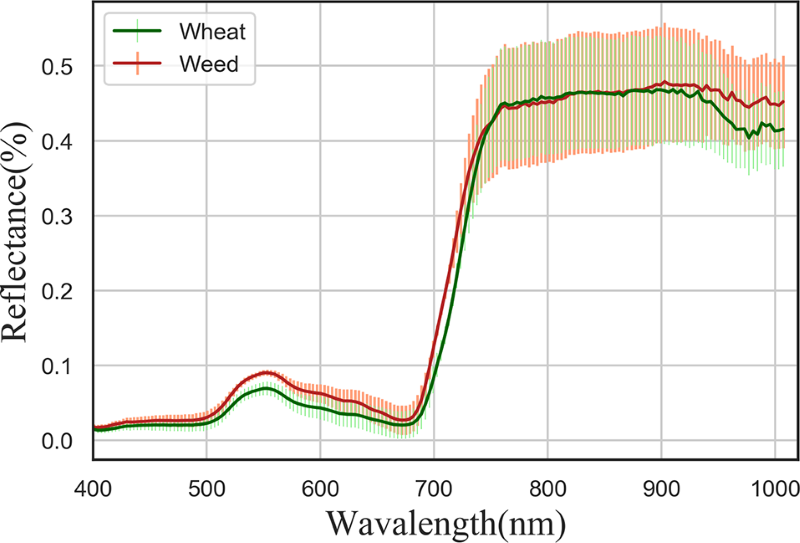 图9杂草与小麦的光谱特征及生物量相关性分析