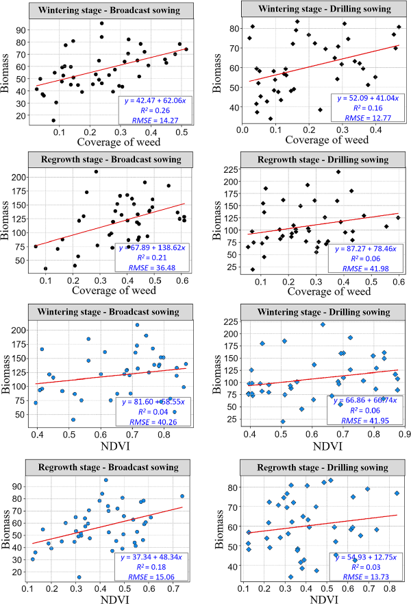 尽管单一植被指数在区分上受限,研究发现部分波段组合的 NDVI 与小麦/杂草生物量存在极高相关性(相关系数 >0.92),例如冬季小麦最佳组合为 (960 nm, 733 nm),冬季杂草为 (960 nm, 719 nm),拨节期亦存在相应的高相关组合。这提示利用恰当的波段组合可以为生物量估算提供有力的光谱特征。基于此,研究将冠层覆盖(CC)与若干植被指数作为输入变量,使用支持向量回归(SVR)建立杂草生物量估算模型。模型建模阶段总体表现良好(建模 R² 均 >0.85):冬季估算精度最高,训练阶段 RMSE 常低于 8 kg·ha⁻¹;但在返青/再生期由于小麦群体增大且混合像元影响增强,建模精度有所下降,RMSE 可上升但通常不超过 20 kg·ha⁻¹。独立验证显示性能存在波动——总体平均验证 RMSE 约 40.03 kg·ha⁻¹;其中钻播冬季表现最佳(验证 RMSE ≈ 9.28 kg·ha⁻¹),而散播返青情形最差(验证 R² ≈ 0.6,RMSE ≈ 30.38 kg·ha⁻¹)。影响精度的主要因素包括:语义分割无法精细量化杂草密度导致 CC 估计偏差、小麦对植被指数的干扰(尤其在返青期)以及田块间播种方式与密度差异。因此,推荐将语义分割的空间定位与基于优选波段的光谱回归相结合,并针对播种方式与生育期进行专门校准,以获得更稳定的生物量估算结果。