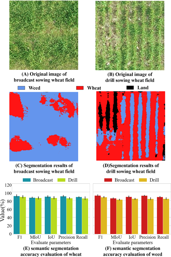 图8 DeepLabV3+的分割结果,(A)、(B)为播撒式和条播式小麦田原始图像,(C)、(D)为分割结果,(E)、(F)为小麦和杂草的分割准确度值