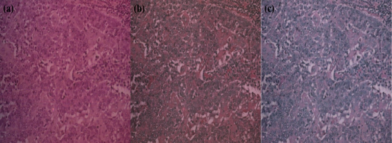 为确保高光谱成像(HSI)在膀胱癌分级中的准确性与可靠性,设计了多步预处理流程。图3 展示了从原始数据到最终去噪结果的演变,并量化各步骤对图像质量的提升效果。图3a:原始图像受噪声与照明不均影响,癌与正常组织难以区分。图3b:经反射率校正后,照明均匀性显著改善,平均信噪比(SNR)提升 21.3%,系统照明伪影被有效抑制,光谱可比性增强。图3c:进一步采用小波多尺度去噪,在保留关键光谱-空间信息的同时抑制高频噪声;峰值信噪比(PSNR)再增 3.7 dB,背景方差降低 28.6%,充分保留诊断结构并减少无关变异。