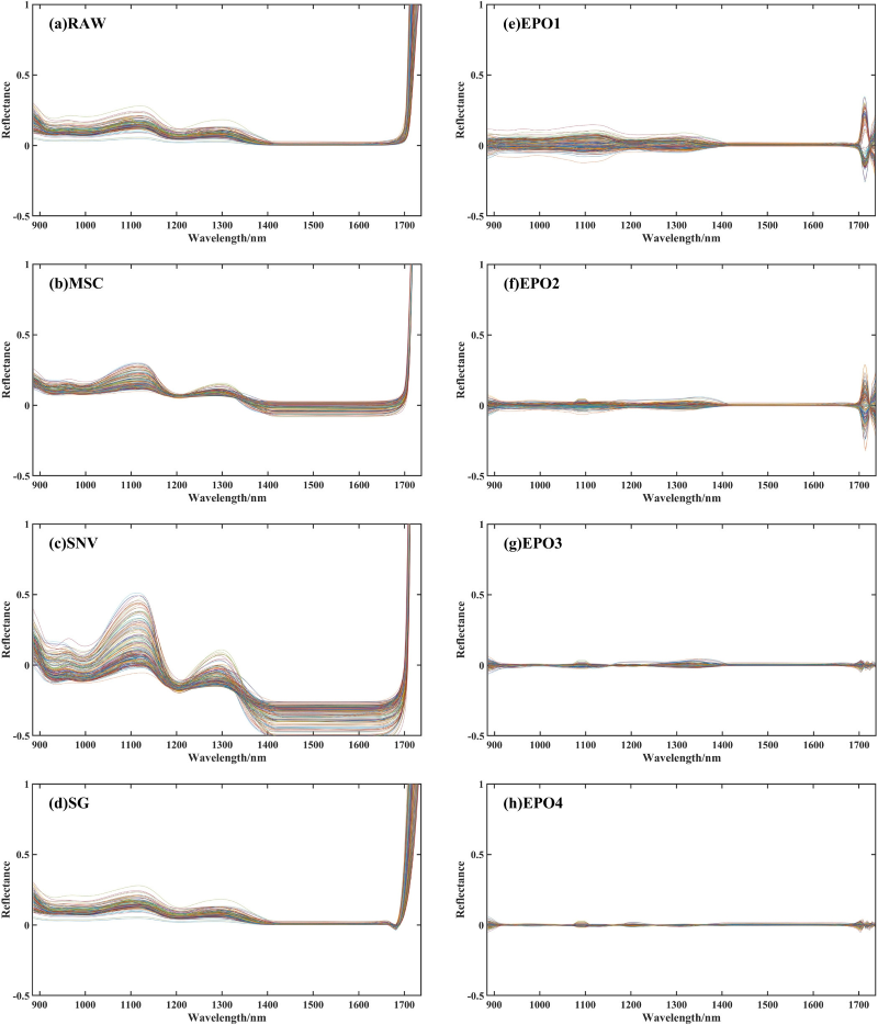 图2(a) 给出了 900–1700 nm 区内,从高光谱图像 ROI 提取的白酒原始近红外光谱。整体曲线平滑,在约 1700 nm 处反射率急剧上升。不同波段反射率的起伏源于特定化学键在对应波长吸收能量所引起的分子偶极矩变化。900–1400 nm 范围内,1100 nm 与 1300 nm 附近出现两个明显反射峰,1200 nm 处可见微弱吸收,对应 C–H 伸缩振动的一级倍频;1400–1700 nm 区段各样品反射率基本相当,差异不显著。图2(b)–(h) 依次展示了原始光谱经 MSC、SNV、SG 及 EPO 算法预处理后的曲线。MSC 与 SNV 均使两处反射峰出现不同程度的强度变化,并显著放大了 1400–1700 nm 区间的反射率差异;SG 仅对 1670 nm 附近的反射强度略有提升,整体变动微小。EPO 则突出了 1700 nm 附近的反射与吸收区域,且随 nlv 增大,曲线逐渐趋于平稳。各方法对反射强度的影响程度不一,但是否能真正提升模型精度仍需进一步验证。