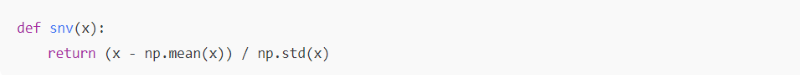 SNV是一种归一化方法,通过对每条光谱进行中心化与标准化,消除光谱间的散射效应或强度差异,并保留光谱的相对形态。公式如下: