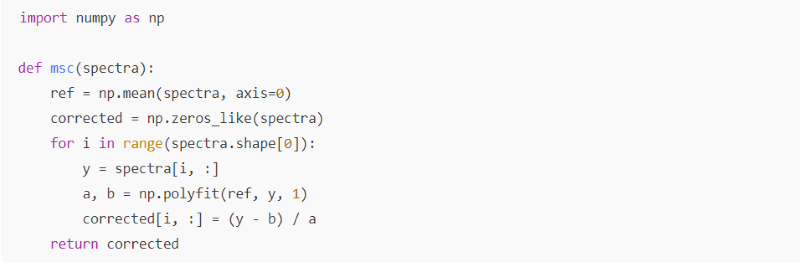 MSC通过线性回归将每条光谱与参考光谱(通常为平均光谱)拟合,校正乘法与加法散射效应。该方法可以校正散射引起的强度差异,保留光谱的形状特征。公式如下: