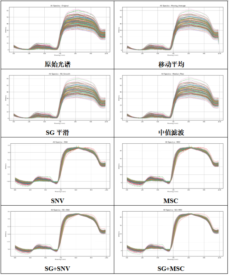 不同预处理方法处理后的光谱曲线如下图所示。相对于原始光谱,平滑预处理方法(如Savitzky-Golay、移动平均和中值滤波)主要消除了光谱曲线上的高频波动,使光谱曲线更平滑,同时保持了整体峰位和基线的基本形态。SNV方法则对原始光谱的幅值和偏移进行了标准化,使不同样品的光谱在同一水平上对齐,同时略微改变了曲线的整体高度。MSC通过线性回归校正光散射造成的幅值和偏移差异,既保持峰形特征,又消除了样品间的散射差异。然而,SNV和MSC没有消除光谱中的高频噪声。组合方法(如SG+SNV或SG+MSC)先对光谱进行高频噪声平滑,再进行散射校正,兼顾了平滑与散射校正的效果,使光谱既平整又保持峰形特征。通过对比处理前后的光谱,可以直观观察到各方法对噪声、散射和基线的调节作用,从而选择最适合的预处理策略。