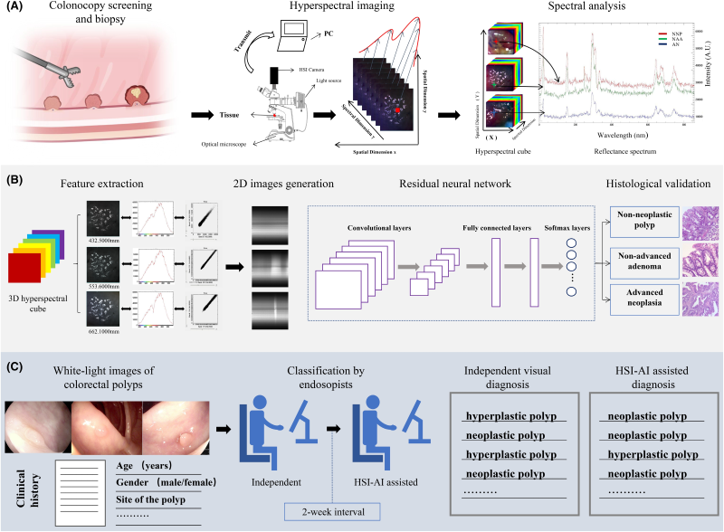 本研究旨在开发并验证一种基于高光谱成像与深度学习(残差网络、迁移学习)的结直肠息肉组织分类算法,用于在内镜检查中快速区分肿瘤性与非肿瘤性息肉,从而推动人工智能辅助的“切除并丢弃”策略落地,提升诊断准确率并降低医疗成本。