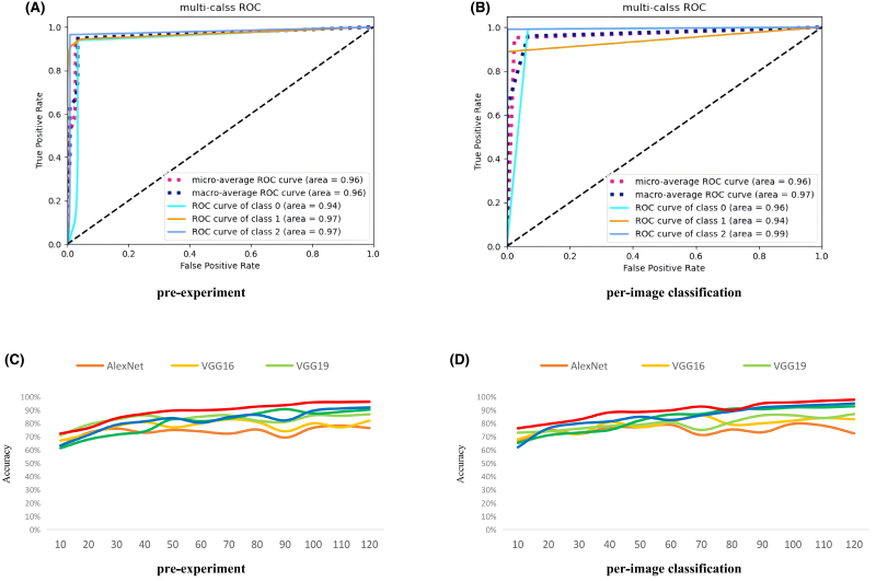 为验证数据的可靠性并探究二维图像数据的相关性,研究进行了两组模型实验。在第一组模型中,研究者将二维图像随机打乱后进行训练,不考虑样本间的个体差异。结果显示,该模型在各组中均取得较高准确率,训练集和测试集的 AUC 分别为 0.97 与 0.96,说明同一样本不同区域的光谱图像之间具有良好的相关性与一致性(图 2A)。