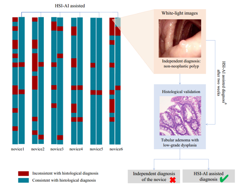 本研究证实利用高光谱成像(HSI)可在新鲜结肠组织上对结直肠息肉实现腺瘤与非腺瘤的高精度区分,并进一步识别进展期肿瘤。该工具显著提升了初级内镜医师的诊断水平,展现了 AI 辅助诊断与结肠镜实时同步的潜力。