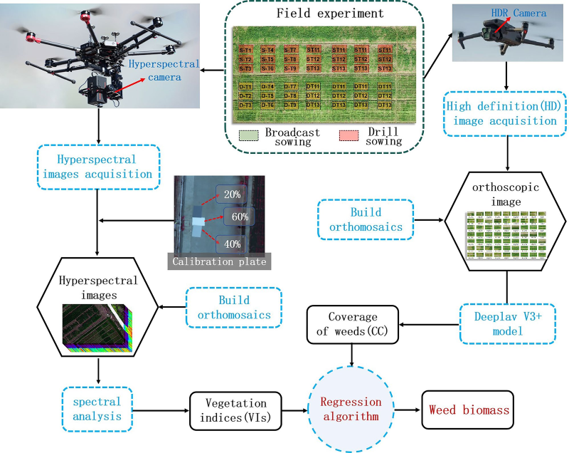 杂草作为与作物竞争光照、营养、水分和生长空间的非目标植物,会导致田间环境恶化,抑制小麦生长发育,造成生长缓慢、发育不良及产量质量下降。大规模杂草侵染可导致小麦产量减少60%,程度取决于杂草密度和干扰持续时间。监测杂草对靶向控制和精确喷洒至关重要,可减少农药消耗和非点源污染。草本杂草(禾本科)在小麦越冬和拔节期为主导杂草,与小麦幼苗形态相似,识别难度大。现有方法包括人工识别、机器视觉和图像提取,但RGB图像信息有限,高光谱成像可提供更多目标信息,提高精度。无人机遥感系统具有快速、非破坏性、低成本和高通量优势,已广泛应用于农业作物生长监测。本研究聚焦小麦田草本杂草识别,利用UAV高光谱图像和深度学习,填补草本杂草(而非阔叶杂草)识别及产量影响评估的空白。