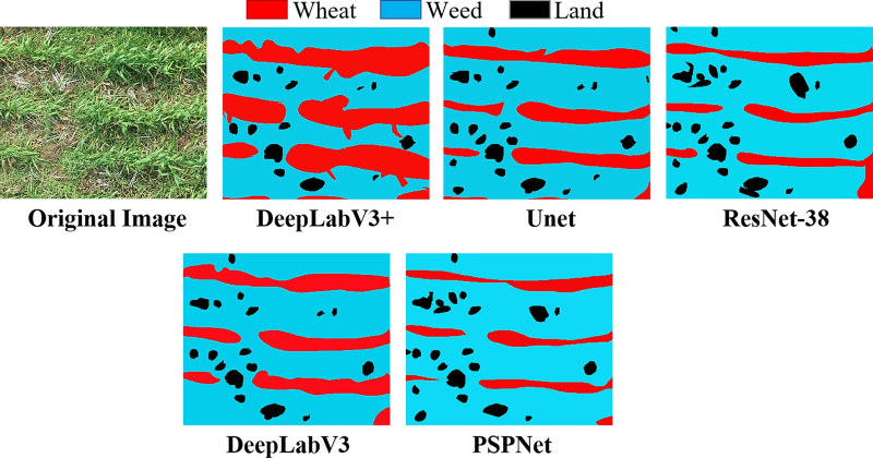 在 RGB 三通道及可见—近红外(400–1000 nm)范围内,杂草与小麦的光谱/颜色特征高度重叠:在 RGB 直方图上三通道分布非常相似,反射率曲线在多数波段亦存在大量重叠,仅在可见光的绿波段和红波段出现有限差异。这意味着单纯依赖颜色或单一植被指数(如 NDVI)在混合像元环境下难以实现可靠分辨,尤其在返青期或株型复杂的田块中误判与漏判风险显著增大。基于此,研究比较了五种主流语义分割模型用于田间杂草识别的效果,结果表明 DeepLabV3+ 综合性能最好:对耕地(land)识别普适性高,对小麦与杂草的区分能力强,边缘区域的识别效果尤为明显。模型在不同播种方式下的检测精度分别为散播田约 91.27%、条播田约 87.51%,MIoU、F1、Precision、Recall 等指标均保持在较高水平(均 >85%)。在实际部署角度看,DeepLabV3+ 的单张图像处理时间约 46.5 ms,具备近实时处理能力,但该模型本身只能判别“有/无”或像元类别,不能直接量化杂草密度或推断个体数量,这是其在工程化应用中的一项重要局限。
