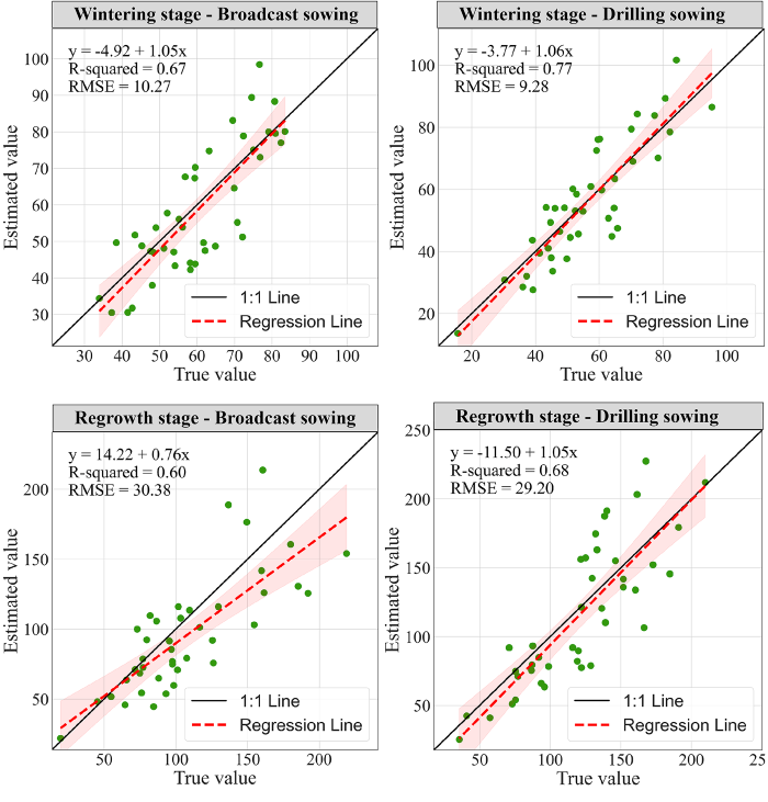 尽管单一植被指数在区分上受限,研究发现部分波段组合的 NDVI 与小麦/杂草生物量存在极高相关性(相关系数 >0.92),例如冬季小麦最佳组合为 (960 nm, 733 nm),冬季杂草为 (960 nm, 719 nm),拨节期亦存在相应的高相关组合。这提示利用恰当的波段组合可以为生物量估算提供有力的光谱特征。基于此,研究将冠层覆盖(CC)与若干植被指数作为输入变量,使用支持向量回归(SVR)建立杂草生物量估算模型。模型建模阶段总体表现良好(建模 R² 均 >0.85):冬季估算精度最高,训练阶段 RMSE 常低于 8 kg·ha⁻¹;但在返青/再生期由于小麦群体增大且混合像元影响增强,建模精度有所下降,RMSE 可上升但通常不超过 20 kg·ha⁻¹。独立验证显示性能存在波动——总体平均验证 RMSE 约 40.03 kg·ha⁻¹;其中钻播冬季表现最佳(验证 RMSE ≈ 9.28 kg·ha⁻¹),而散播返青情形最差(验证 R² ≈ 0.6,RMSE ≈ 30.38 kg·ha⁻¹)。影响精度的主要因素包括:语义分割无法精细量化杂草密度导致 CC 估计偏差、小麦对植被指数的干扰(尤其在返青期)以及田块间播种方式与密度差异。因此,推荐将语义分割的空间定位与基于优选波段的光谱回归相结合,并针对播种方式与生育期进行专门校准,以获得更稳定的生物量估算结果。