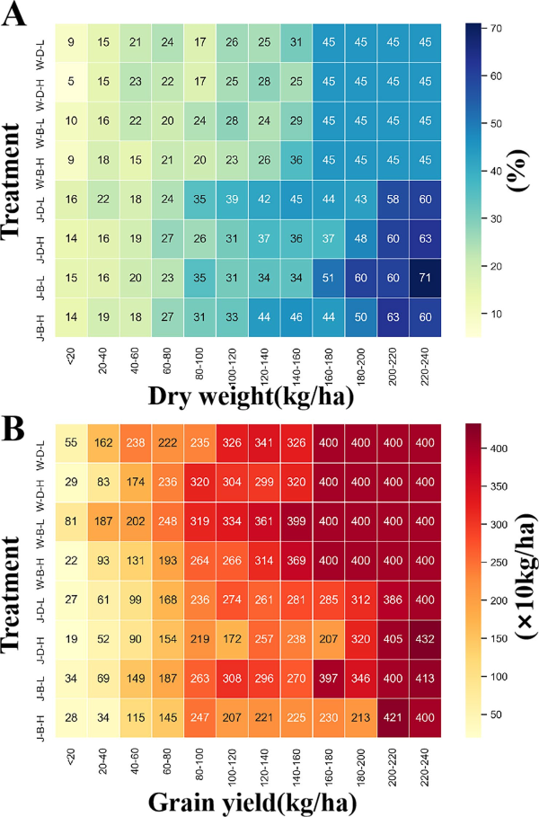 图11杂草对小麦生长的影响。(A)杂草对小麦干重的影响,(B)杂草对小麦籽粒产量的影响。J:拔节期”(Jointing),W:越冬期,B:撒播,D:穴播,L:植株密度180×10^4株/公顷,H:植株密度300×10^4株/公顷