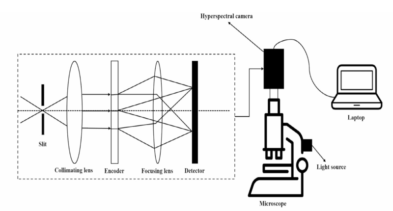 本研究中使用的采集设备是GaiaMicro-V10显微高光谱系统。GaiaMicro系列代表了能够在宽光谱范围内捕获组织光谱信息的高性能显微高光谱成像系统(400- 1000 nm)。GaiaMicro-V10配备高灵敏度CCD传感器,并具有 16 bit 的量化深度,可实现高动态范围与高精度的光谱数据采集。其光学孔径为 F/2.4,光谱分辨率为 2.8 nm,空间采样间隔(像素尺寸)为 0.5μm,可在显微尺度上获取组织的精细结构特征。系统生成的图像尺寸为 2048×2048 像素,能够实现高空间分辨率的样品精细分析并捕捉微小结构细节。其系统结构示意图如图 1 所示。