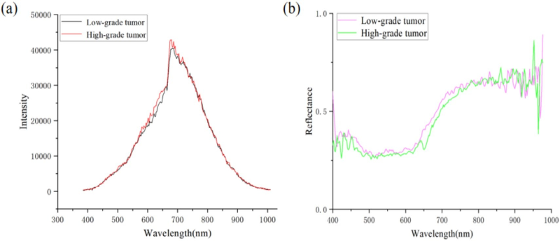 图4 展示了不同分级膀胱癌肿瘤样本经高光谱成像获取的光谱特征。(a) 为低级别与高级别肿瘤的光谱强度曲线,(b) 为对应的反射率光谱曲线。两图直观呈现了不同分级肿瘤在光谱维度上的差异,为模型后续分类与分级提供了关键的光谱依据。