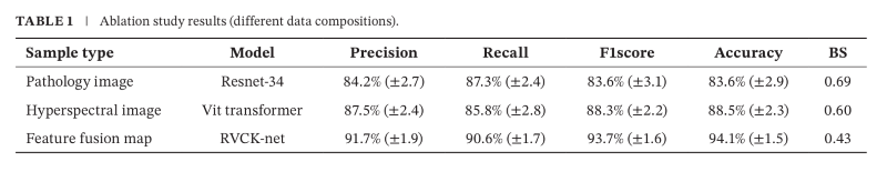 为验证多模态融合(病理 + 高光谱)在膀胱癌分级诊断中的有效性,作者设计了对照实验:先分别单独使用病理图像与高光谱图像进行特征提取与分类,以评估各模态的独立贡献;随后采用 RVCK-net 融合两类特征,验证多模态协同带来的性能增益。具体结果见表1。具体来说,病理图像模型取得了83.6%的准确率(±2.9%),Brier评分为0.69,而高光谱图像模型的精度达到88.5%(±2.3%),Brier评分降低0.60。这表明高光谱成像在捕获组织光谱细节方面的优势,使膀胱癌的诊断更加精确。然而,无论是病理图像还是高光谱图像,单模态特征在准确性和鲁棒性方面都存在局限性,尤其是病理图像模型在处理数据复杂度和光谱信息方面存在局限性,而高光谱图像模型虽然能够捕捉到丰富的光谱信息,但缺乏详细的空间结构信息。