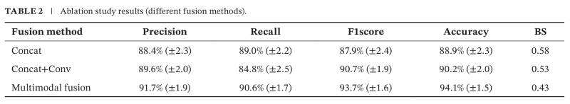 为了进一步验证特征融合模块在膀胱癌分级模型中的有效性,作者使用三种不同的特征融合方法进行了消融实验:简单连接(Concat),连接后进行卷积(Concat+Conv),实验结果表明,采用简单拼接的模型准确率为88.9%(±2.3%),Brier评分为0.58。引入卷积后,准确率提高到90.2%(±2.0%),Brier得分下降到0.53,说明卷积运算起到了增强特征提取能力的作用,但随着多模态融合策略的使用,模型性能全面提升,准确率达到94.1%(±1.5%),并进一步将Brier评分降至0.43,采用不同融合策略的消融实验进一步验证了多模态融合模块的优越性。
