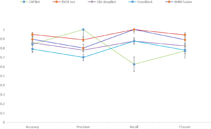图5与图6分别展示了混淆矩阵及核心指标(准确率、精确率、召回率、F1 分数)。综合可见,RVCK-net 在多项关键指标上均表现最优。图5b的混淆矩阵显示,RVCK-net仅出现1例假阳性、未发生假阴性,测试阶段所有阳性样本均被检出,这一特性对亟需高敏感度的早期筛查尤为关键。结合图6的量化指标,RVCK-net在多项评价维度上均居前列,其召回率显著优于其他模型,提示假阴性率大幅降低,同时在敏感度与精确度之间实现了更佳平衡。