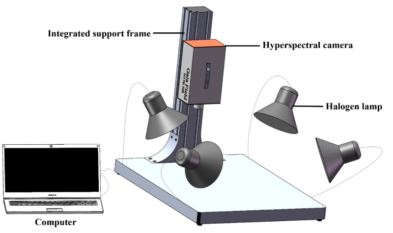 在这项研究中采用的HSI系统包括一个高光谱相机(GaiaField-N17 E-HR),高光谱成像系统的集成支架,四个55 W卤素灯和一台配备数据采集软件SpecVIEW的计算机。HSI系统的组成图见图1。本研究选用的高光谱相机来自江苏双利谱成像科技有限公司,可在近红外(NIR)900–1700 nm 波段范围内采集图像。该相机的光谱分辨率为 5 nm,像素维度为640*512(空间维度 × 光谱维度),共生成 512 个光谱通道。为保证采集到的高光谱数据具有较高准确性,系统参数设置如下:电机起始位置为 0.55 cm,运动距离为 1 cm,前进速度为 0.075 cm/s,后退速度为 0.2 cm/s,相机增益设为 2,曝光时间设为 2 ms。样本图像的 R、G、B 值分别调整至 954.15、927.55 和 904.28,且样本与相机镜头之间的距离保持为 40 cm。