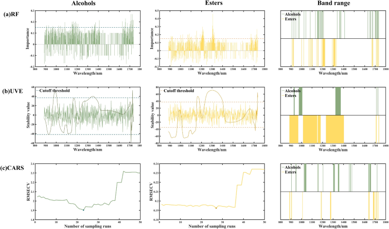 为降低计算复杂度并提升模型精度,本研究采用 RF、UVE 与 CARS 三种特征提取算法,从光谱中筛选与醇、酯相关的特征波长。图3 给出了各方法的选取标准及波段分布:RF 以“重要性 > 0.15”为阈值;UVE 通过统计特征与目标变量的相关性,保留位于上下边界线之外的变量;CARS 则以采样过程中 RMSECV 先降后升的最低点对应的变量数作为最优波长。三种方法均将 1700 nm 附近视为关键区,1400–1600 nm 区间入选波段较少。细节差异方面,RF 为醇类选出的波段更分散,在 1350 nm 与 1650 nm 处明显多于酯类;UVE 在 1000–1300 nm 范围内为醇类保留的波段少于酯类;CARS 则为醇类额外挑出了 1300–1500 nm 段及更多 1650 nm 附近的波长。