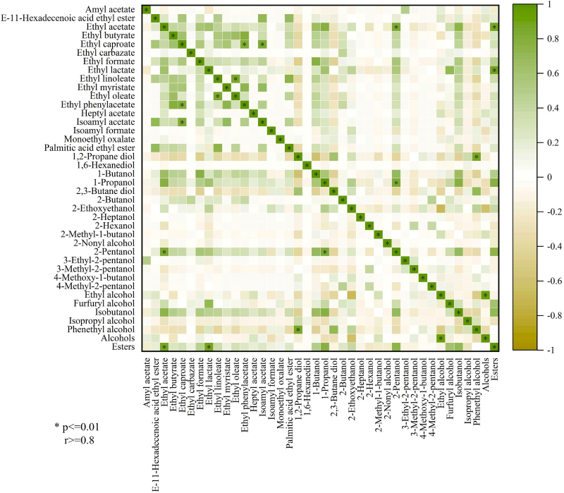 图4 单体香气化合物与醇类、酯类的相关性分析(* 表示 p ≤ 0.01 且 |r| ≥ 0.8)